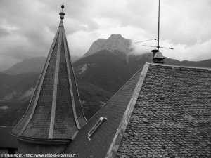 | ancienne maison forte reconvertie en hôtel et vue sur le massif du Dévoluy | cadran solaire dans le village de Aspres-les-Corps | cadran solaire dans le hameau de Brudour |