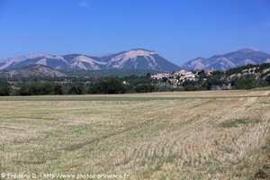 Au loin se détachent la montagne de Saint-Genis et la Crête des Selles (extrémité sud-est du chaînon de la montagne d'Aujour) qui dominent la plaine alluviale de la Durance.
