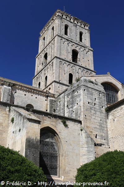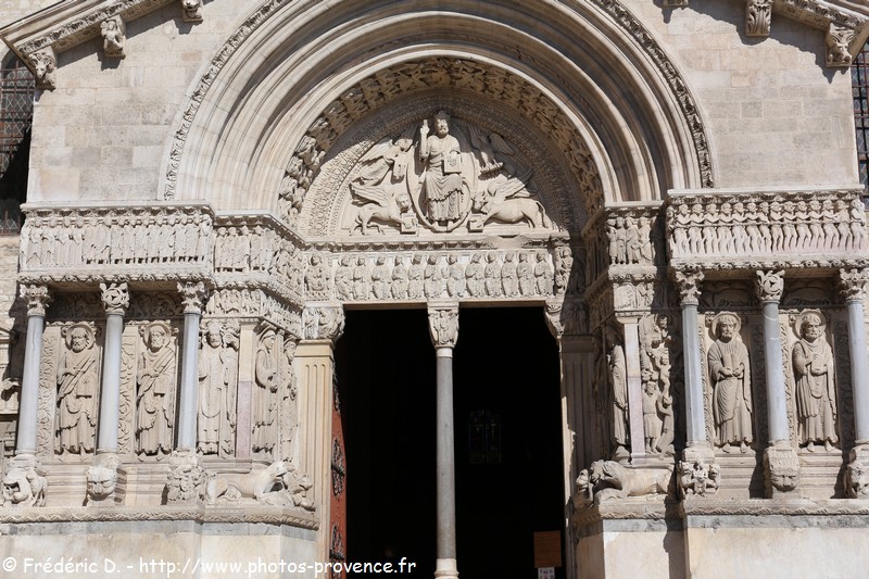 L'église actuelle fut édifiée dans la deuxième moitié du XII° siècle et elle constitue un des édifices majeurs de l'art roman provençal. Sa façade, initialement sobre, fut ornée d'un extraordinaire portail sculpté vers 1180-1190. Consacré à l'évocation du jugement dernier, la façade propose également aux fidèles un modèle de vie et une illustration des gloires de l'Eglise d'Arles.