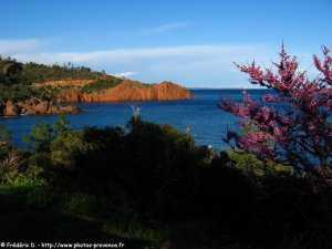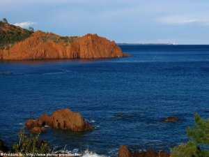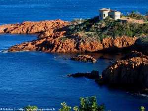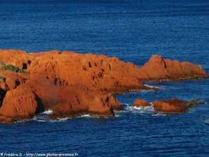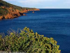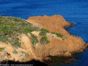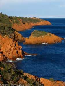 , les roches rouges du massif de l'Estérel plongent dans les différentes teintes bleutées de la mer Méditerranée.