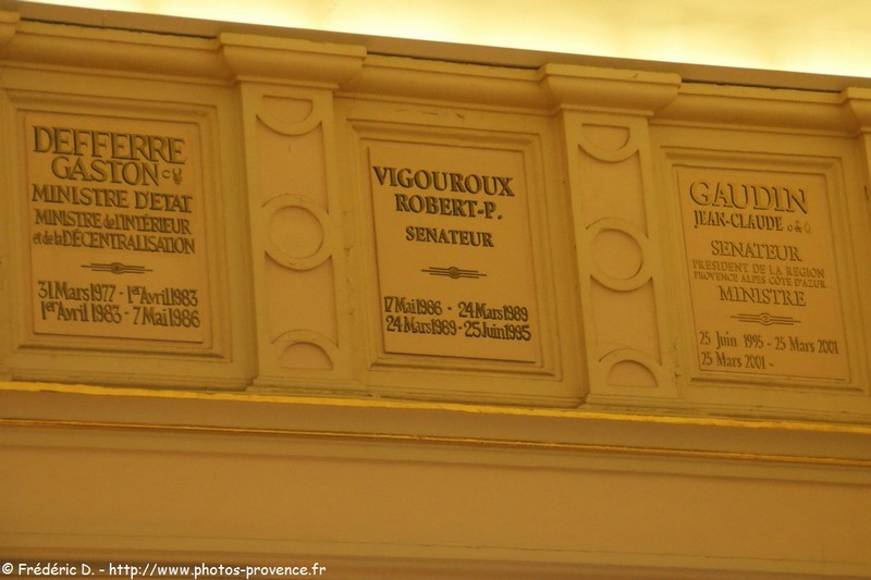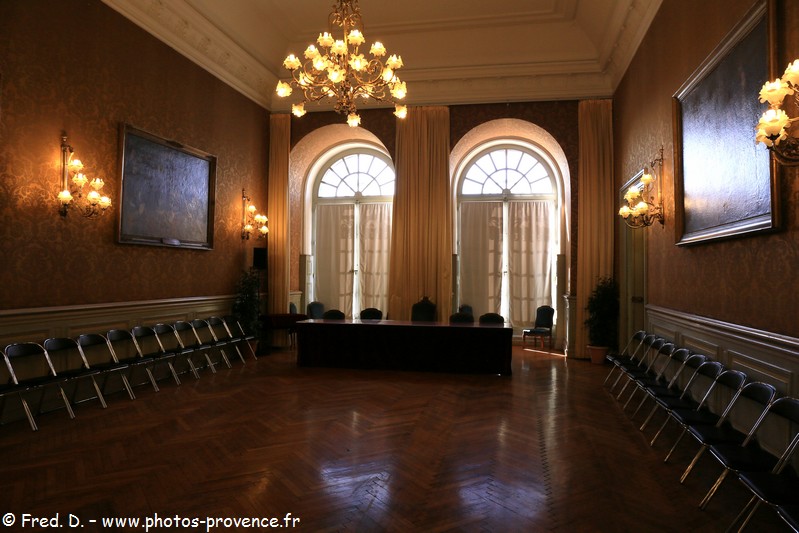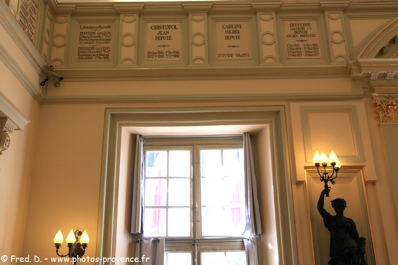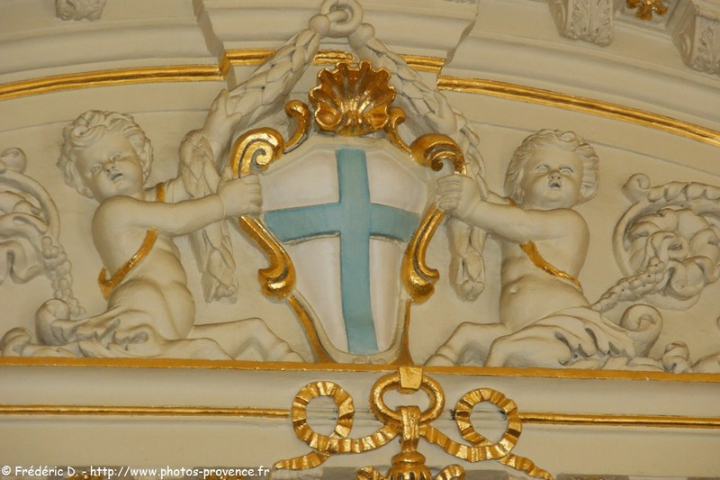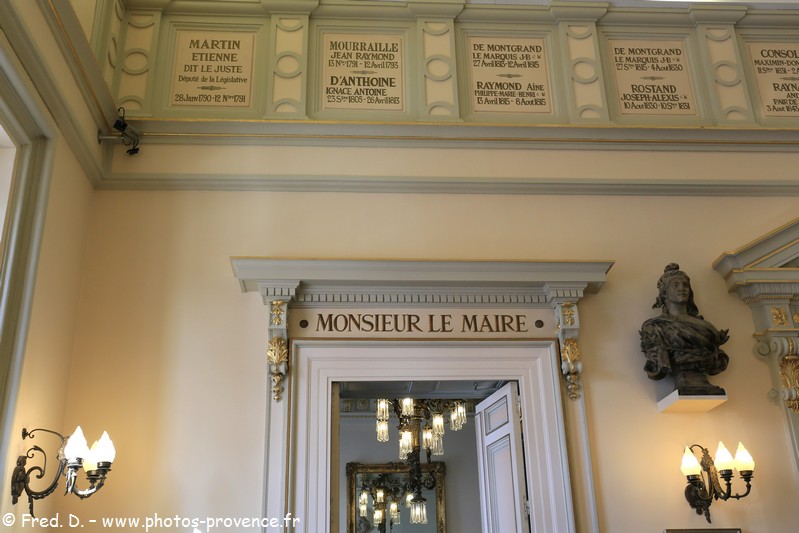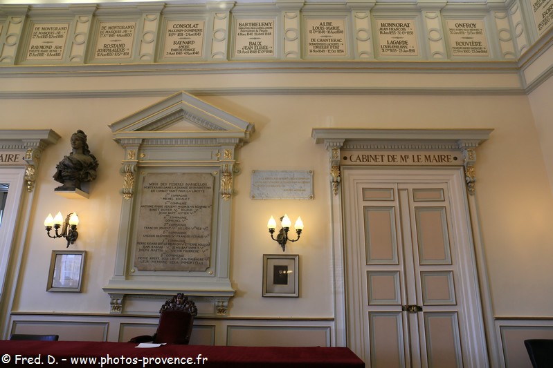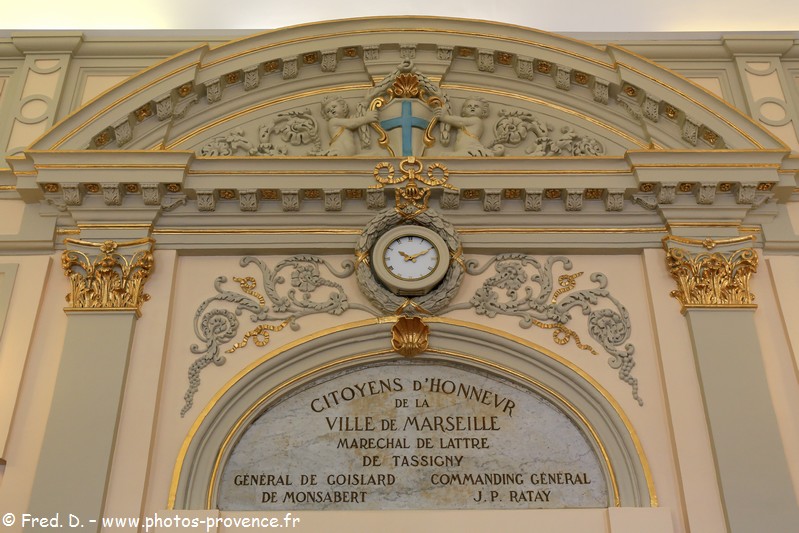 A l'intérieur de la mairie, vous pourrez admirer le beau blason "d'argent à la croix d'azur". Dans la salle de l'espace Bargemon, c'est le blason de la ville de 1883 qui resplendit : "actibus immensis urbs fulget Massiliensis" signifiant "la ville de Marseille resplendit par ses hauts faits".