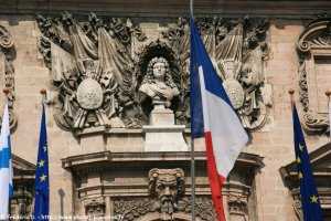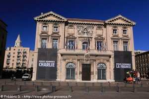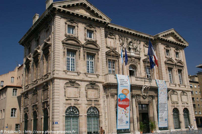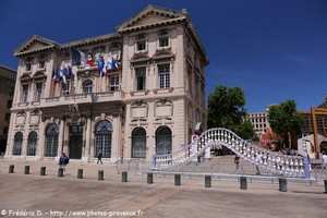 | l'hôtel de ville de Marseille vue depuis le quai Rive Neuve, avec l'hôtel Dieu et l'église des Accoules derrière | |